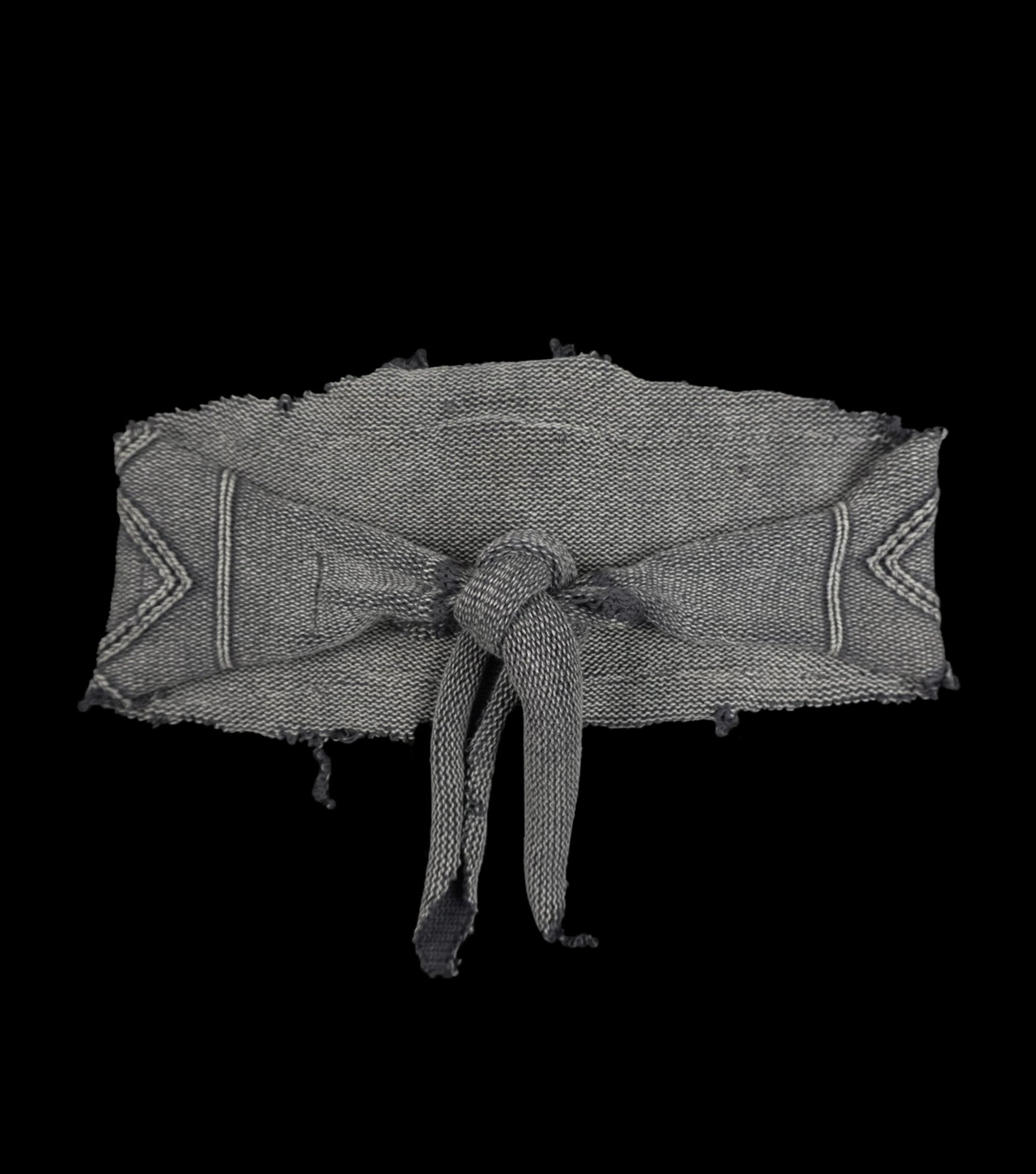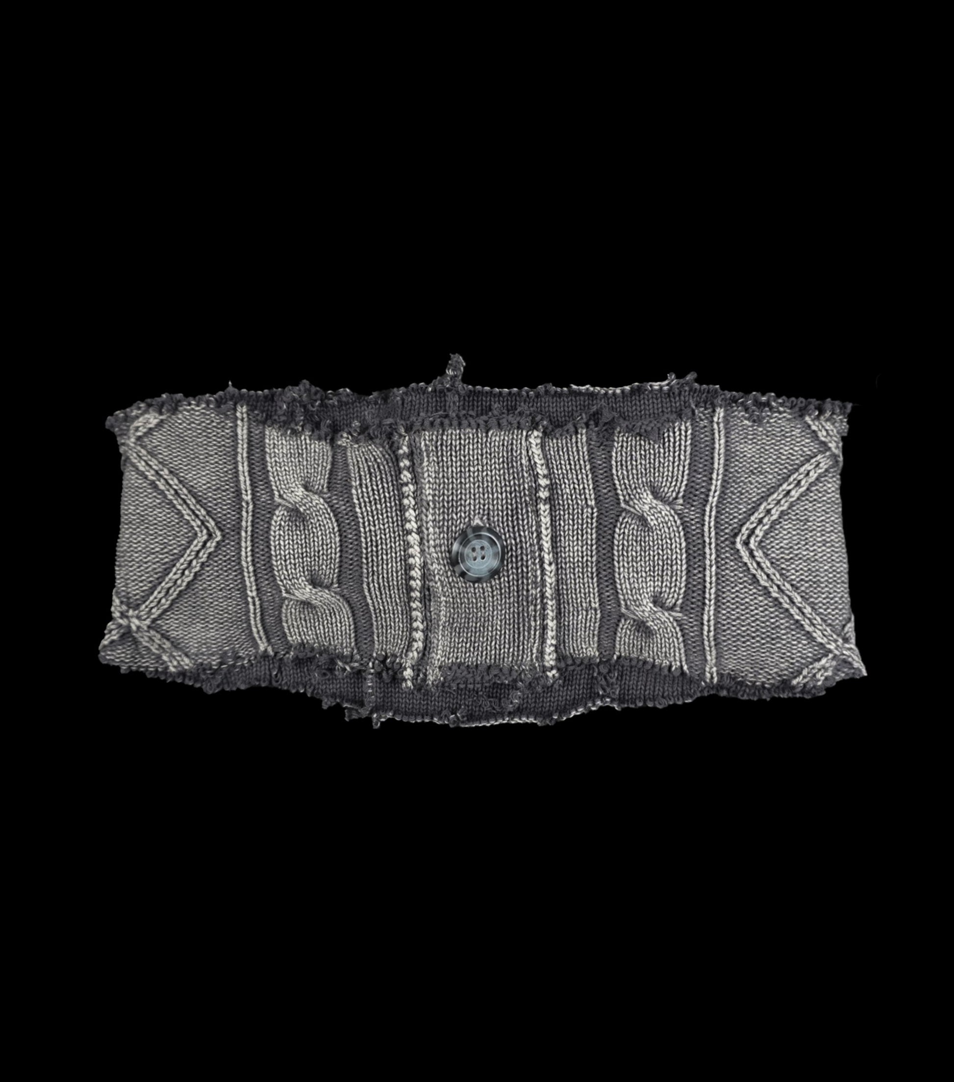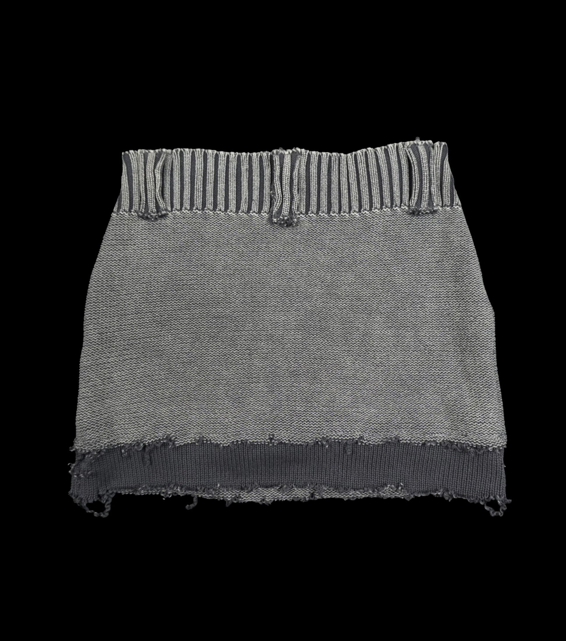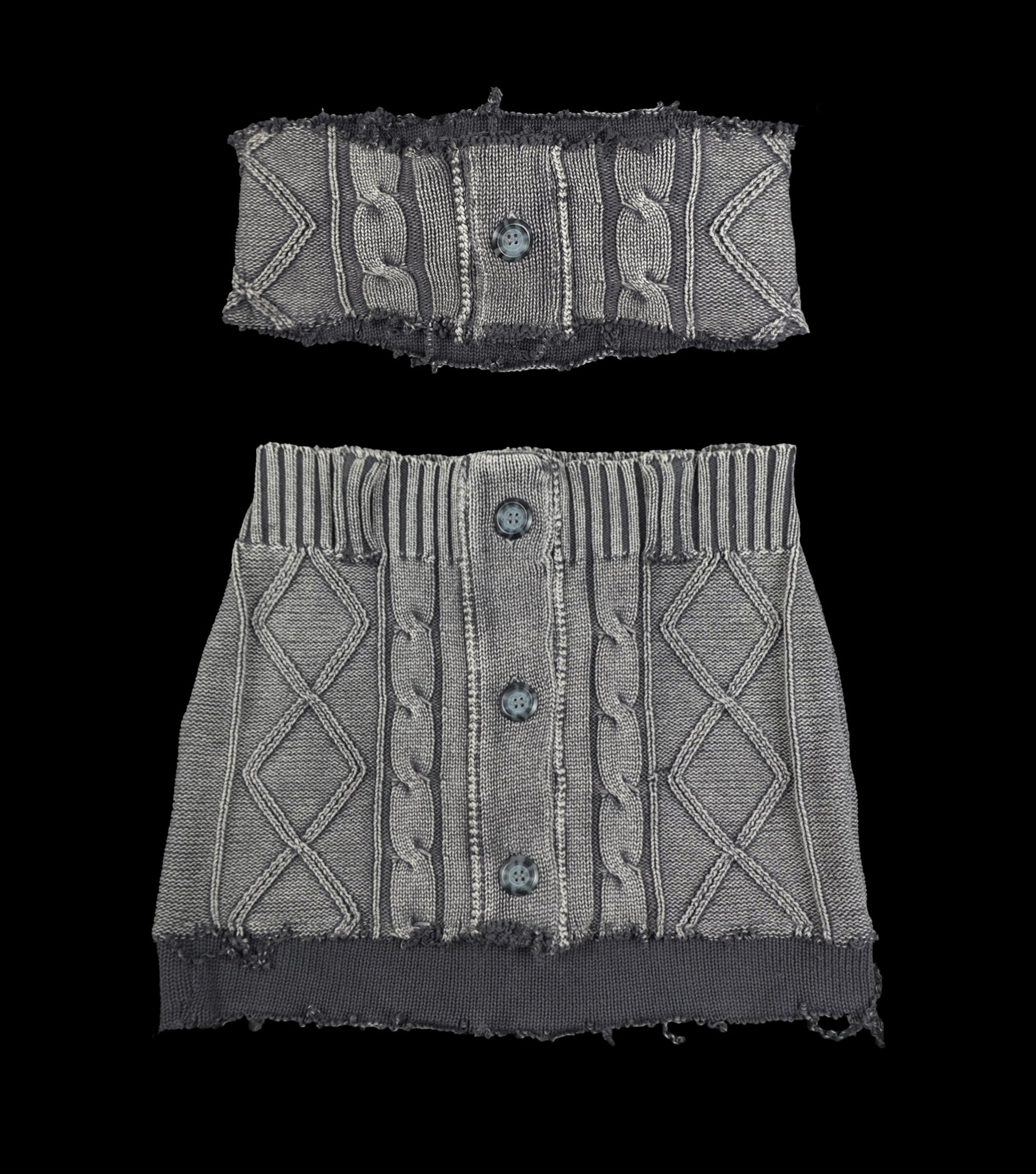 A distressed washed grey knitted bra and mini skirt set upcycled from a knit sweater.